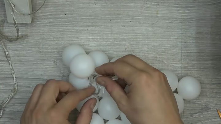 Внутрь вставить лампочку от гирлянды. Провод спрятать между шариков.