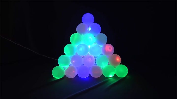 Шарики для пинг-понга склеить между собой в треугольник, используя горячий клей. Это первый ряд.