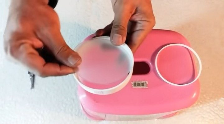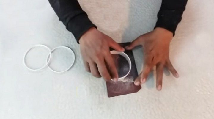 На листе полупрозрачного гибкого пластика обводим внутренний диаметр широкого кольца и вырезаем.