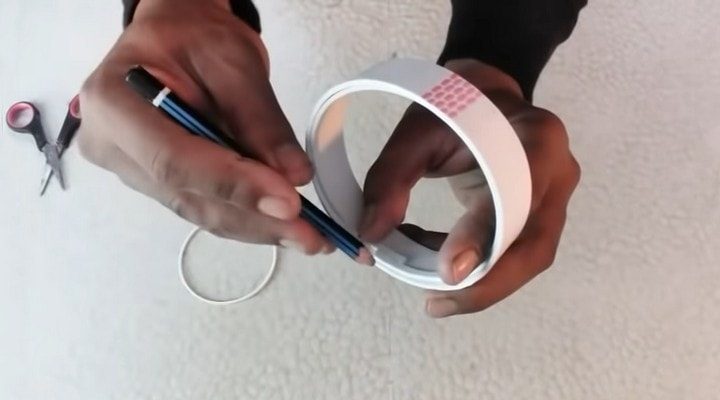 Для проекта подойдут ПВХ трубы трех размеров, к примеру 5 см, 6 см, и 7,5 см. Сначала нужно нарезать по 11 колец шириной 2 см из трубы каждого диаметра. Делать это удобно таким образом: поставьте на трубе метки через каждые 2 см, а затем скрутите вокруг трубы лист бумаги. Совместите край листа с отметкой и обведите карандашом вокруг.