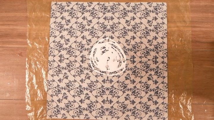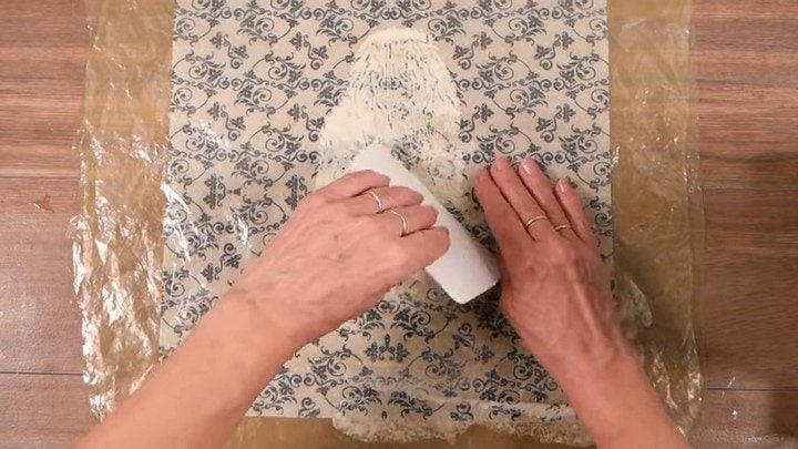 Далее накройте салфетку вторым слоем полиэтилена. Используя любой удобный предмет в качеств шпателя, аккуратно и тщательно распределите клей под полиэтиленом по поверхности салфетки. Важно, чтобы бы не было пропусков и сухих мест. Если где-то клея не хватило — приподнимите полиэтилен и добавьте.