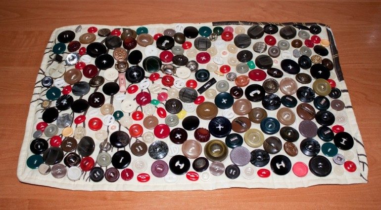 Поместить пуговицы в хаотичном порядке и размере. Лучше прикрепить сначала большие пуговки на разных частях изделия, а уже после к ним присоединять маленькие.