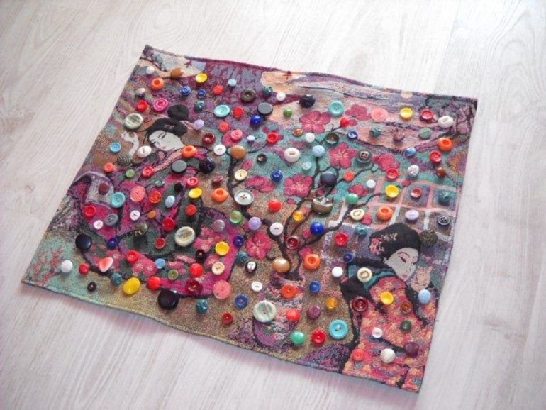 Элементы, которые необходимы для пошива изделия:Пуговицы различных диаметров от маленьких до больших. Количество их зависит от размера изделия.Липучки. Для скрепления частичек коврика.