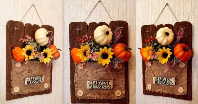 Внутрь в мешочек поместите различный осенний декор: искусственные цветы, фрукты и овощи и пр.