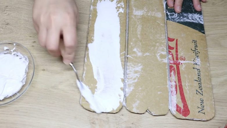 Приклейте полоски к основе. Обратите внимание: они будут имитировать доску, поэтому сделайте небольшие зубцы с одной стороны полосок.