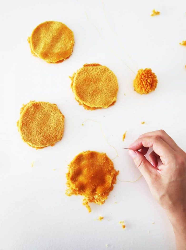 Сделайте необходимое количество помпонов из флиса для оформления своего одеяла.