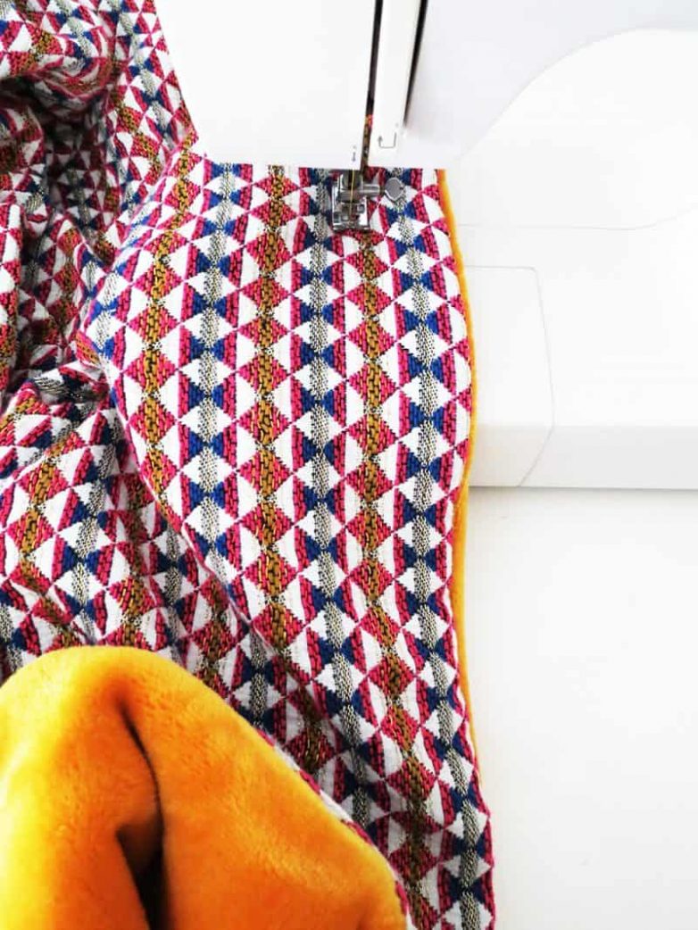 С помощью швейной машины сшейте ткани друг с другом. Оставьте на зашитым отверстие примерно 30 см. Не зашитая часть должна быть достаточно широкой, чтобы через нее можно было вывернуть ткани на лицевую сторону.