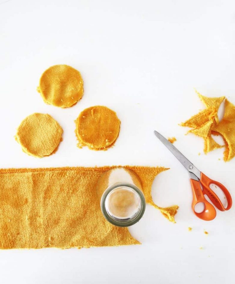 Сделать помпон из флиса очень просто. Вырежьте круги из ткани. Нитками в цвет прошейте ткань по кругу, затем аккуратно вытяните нить и завяжите двойной узел.