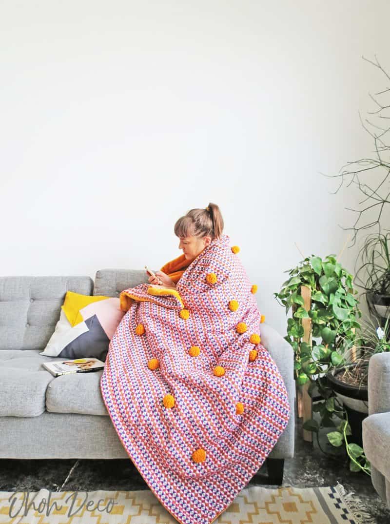 Пришейте помпоны к одеялу, надежно закрепив их нитками в цвет.