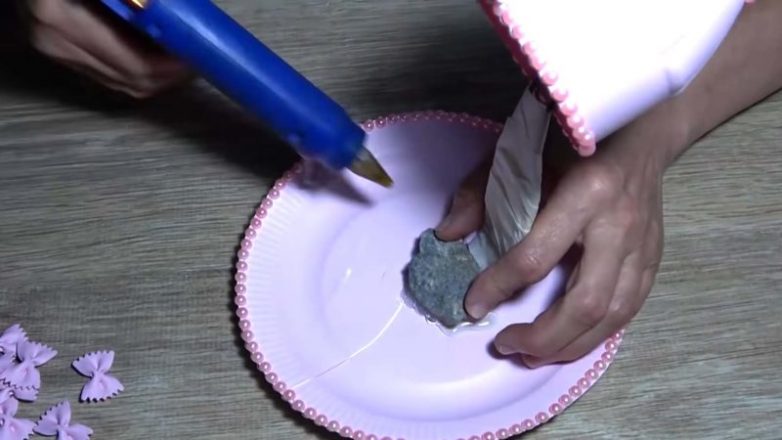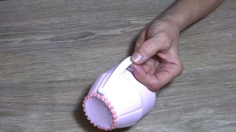 Покрасьте акриловой краской розового цвета. Вырежьте и приклейте ко дну фоамиран.