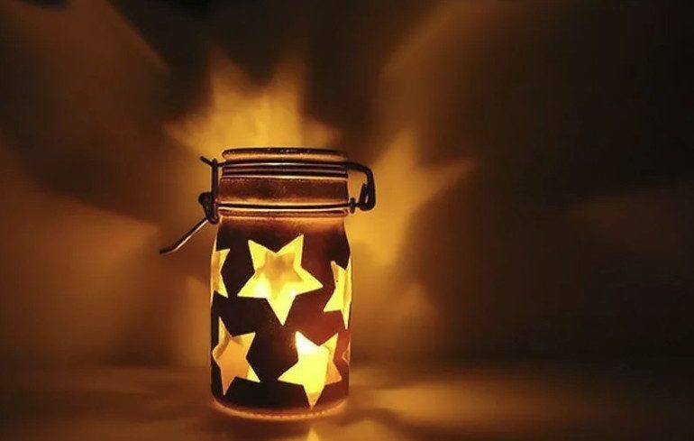 Первым делом, следует отрезать кусок фольги согласно высоте подобранной банки, и сделать в ней как можно большее количество дырок при помощи шила и разместить внутри емкости. Далее туда же следует положить горящий фонарик, и наслаждаться окружающей «космической» обстановкой, создаваемой самодельным звездным ночником.
