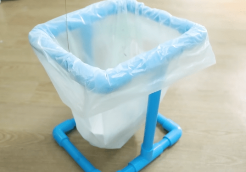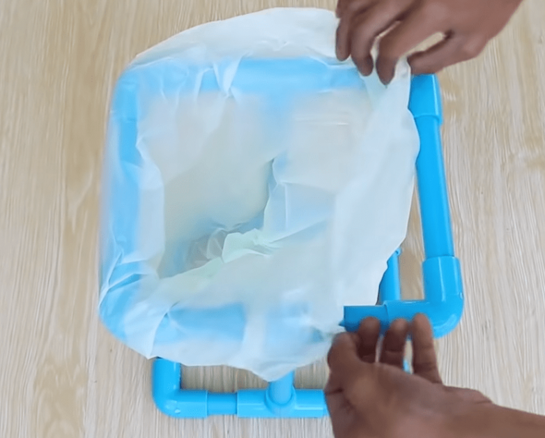 Дальше остается лишь надеть на верхнюю рамку мусорный пакет и расправить его.