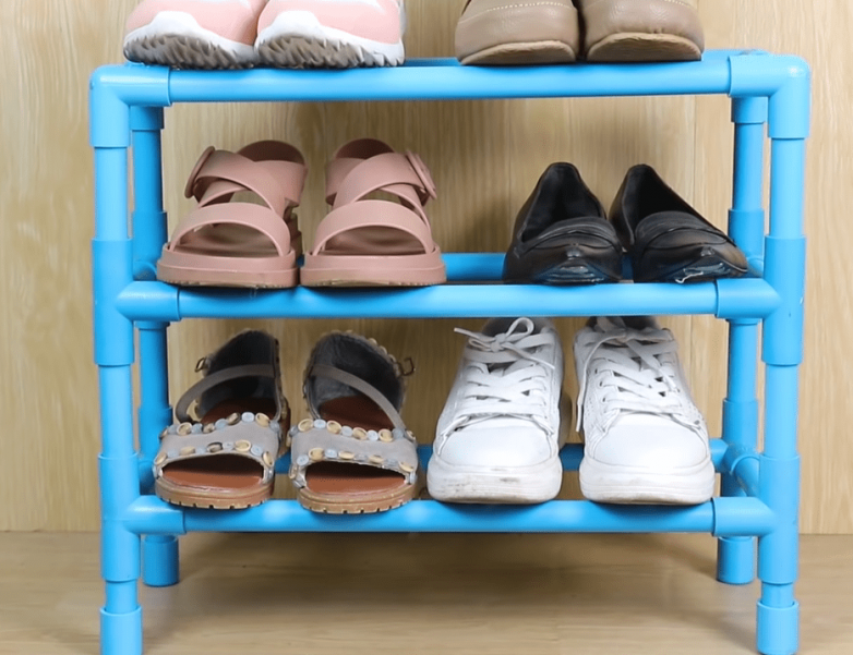 Оригинальная обувная полка не занимает много места. При этом сделать ее легко с учетом размера обуви и ее наличия. Удобно и то, что при необходимости количество ярусов можно нарастить.