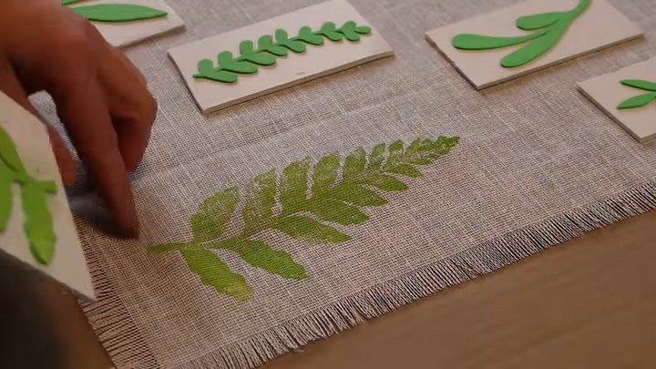 После того, как все оттиски сделаны, необходимо закрепить краску в ткани, прогладив изделие с изнанки горячим утюгом. После такой обработки скатерть можно будет стирать в машинке в режиме деликатная стирка.