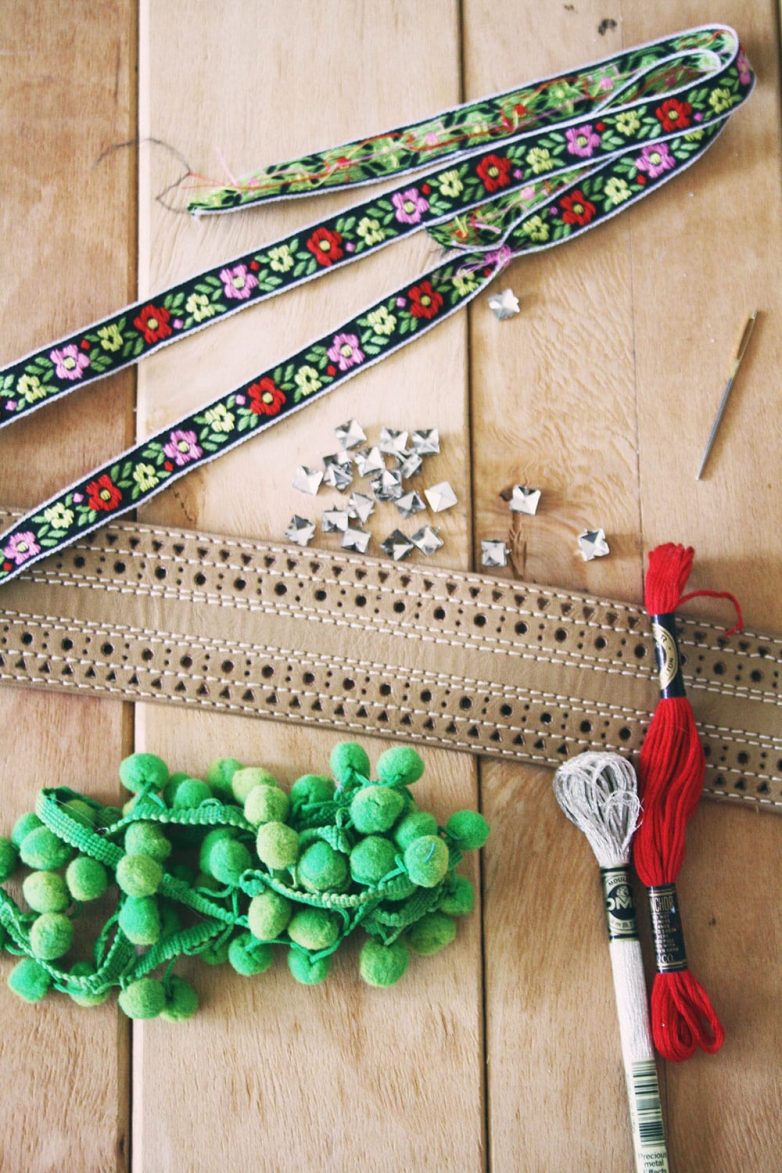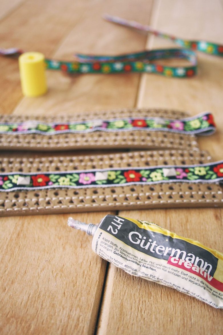 Если ширина ремня позволяет, и вы хотите получить еще более яркий аксессуар, приклейте к поясу еще один отрез тесьмы с другим узором.