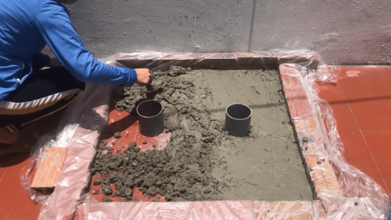 Застилаем получившееся внутри пространство целлофаном. Размещаем посредине 2 обрезка трубы большого диаметра, а затем заполняем оставшееся пространство цементным раствором.