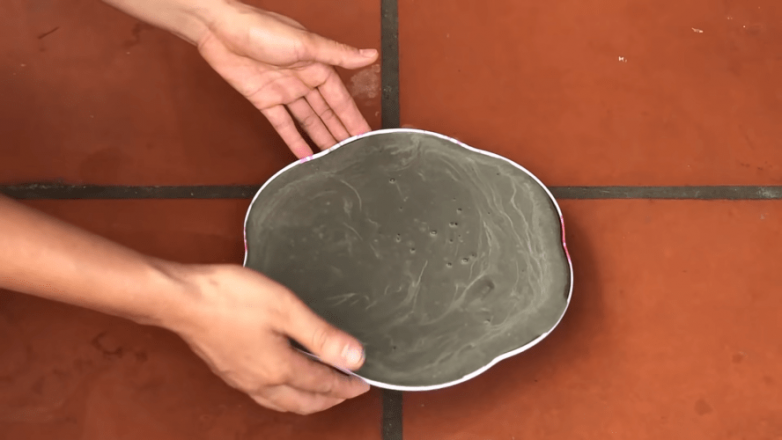 Заполнив блюдо цементным раствором, равномерно распределяем его на поверхности и оставляем в покое до полного застывания.