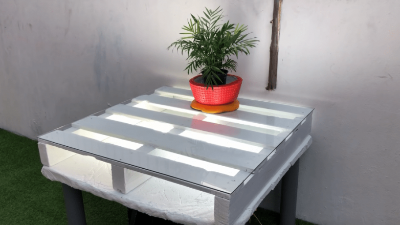 Сверху укладываем кусок толстого стекла, вырезанный под нужный размер. Дальше остается лишь водрузить на стол горшок с цветком или другой элемент декора и включить подсветку.
