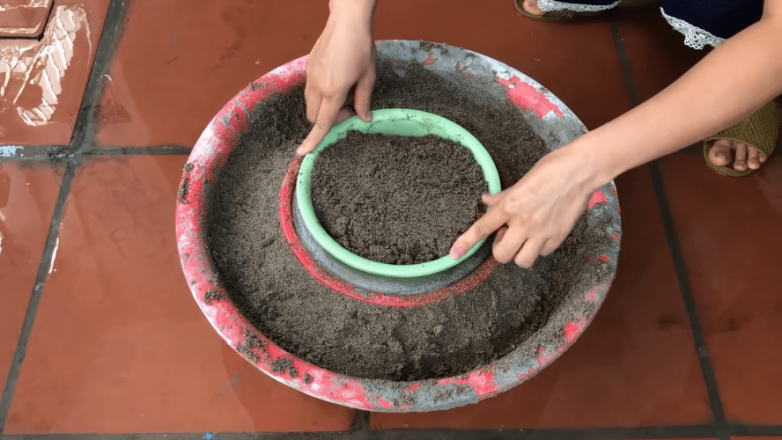 Для создания цветочного горшка используем сразу несколько емкостей разного диаметра. Для удобства эаливка осуществляется в тазике, наполненном влажным песком. В качестве внешней формы используем сито: именно в него будет заливаться цементный раствор. Непосредственно в раствор погружаем емкость меньшего размера, дополнительно утяжеленную песком. Важно, чтобы вытесненный цемент распределился вдоль стенок равномерно. Дальше остается лишь дождаться полного застывания.