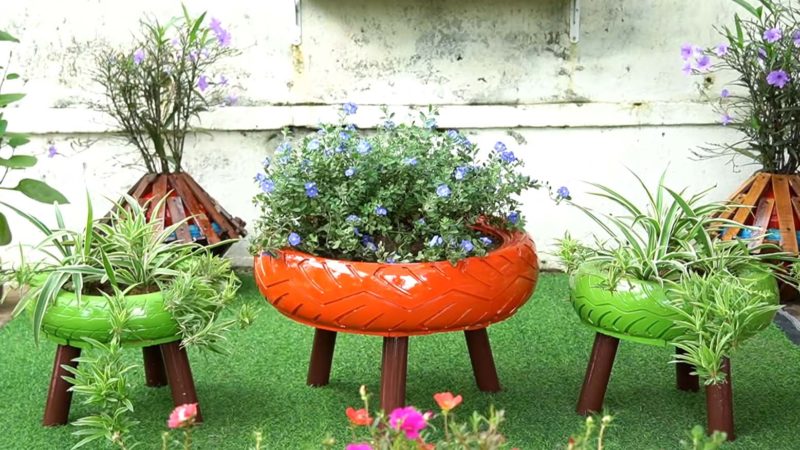 Классные вазоны на ножках можно сделать из ненужных покрышек, досок и труб ПВХ! Очень бюджетный, оригинальный и полезный проект, который поможет вам украсить любимый сад.