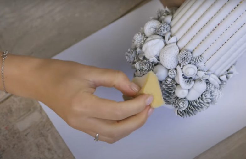 Для этого нанесите на губку небольшое количество клея ПВА и насыпьте на нее блестки.