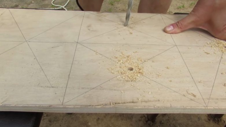 Вырезать фанеру. В местах пересечения меток сделать отверстия.