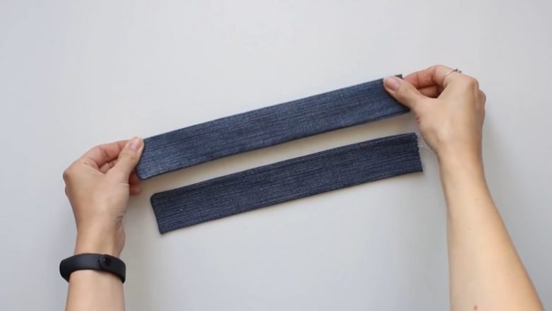 Джинсы разных оттенков нарезать на полосы.