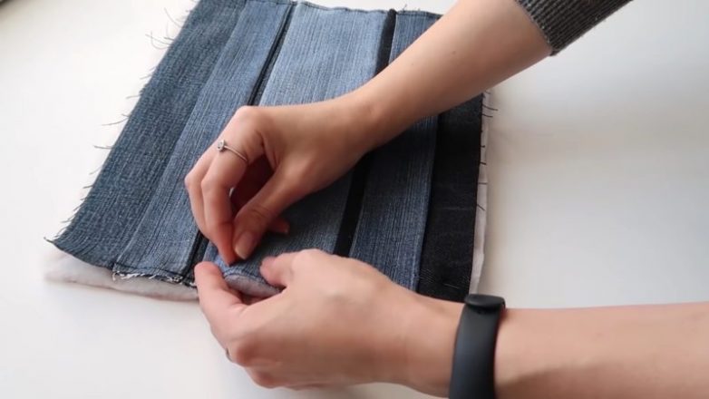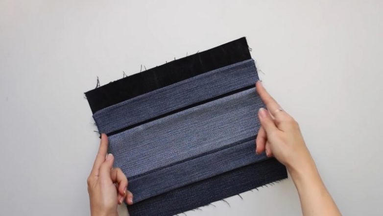 Три детали разного цвета сшить между собой и прогладить. Понадобится две таких детали из 3 полос джинсовой ткани (две стороны косметички).