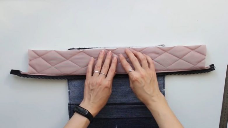 Пришиваем джинсовые полосы к одной из сторон косметички, делая хорошие закрепки, чтобы ткань прочно держалась.