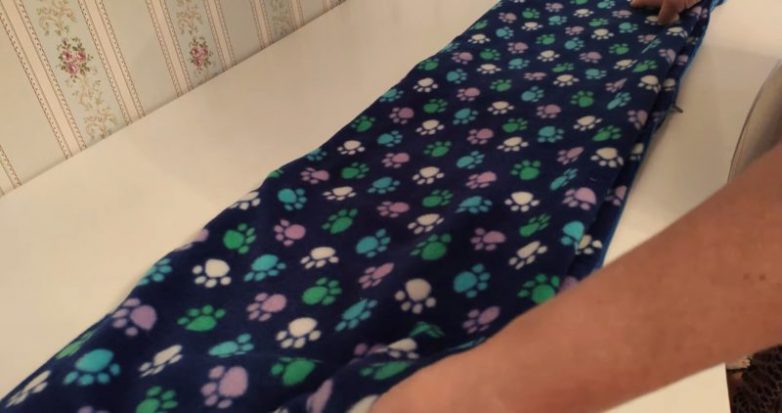 Приготовьте плед, два куска ткани 35*35 см (сшейте их вместе) или один 35*70 см. По желанию можно дополнительно на этом прямоугольном куске ткани сделать аппликацию.