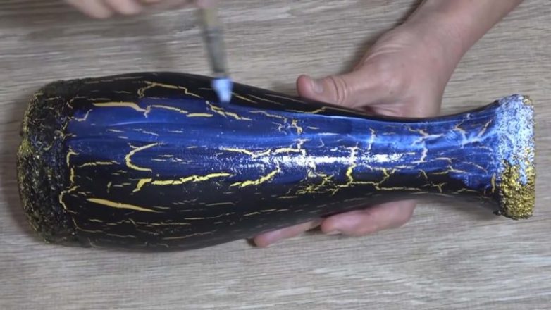 Её также высушим феном. Здесь начнет происходить волшебство: чёрная краска потрескается, и в трещинках будет видна золотая краска!
