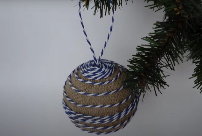 Из декоративной веревки сделайте петельку. Используйте эту веревку для оформления шарика, обкручивая его по спирали.
