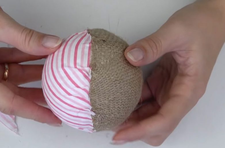 Сделайте на шарике разметку посередине и приклейте к каждой половине отрезы мешковины, аккуратно обрезая лишнюю ткань.