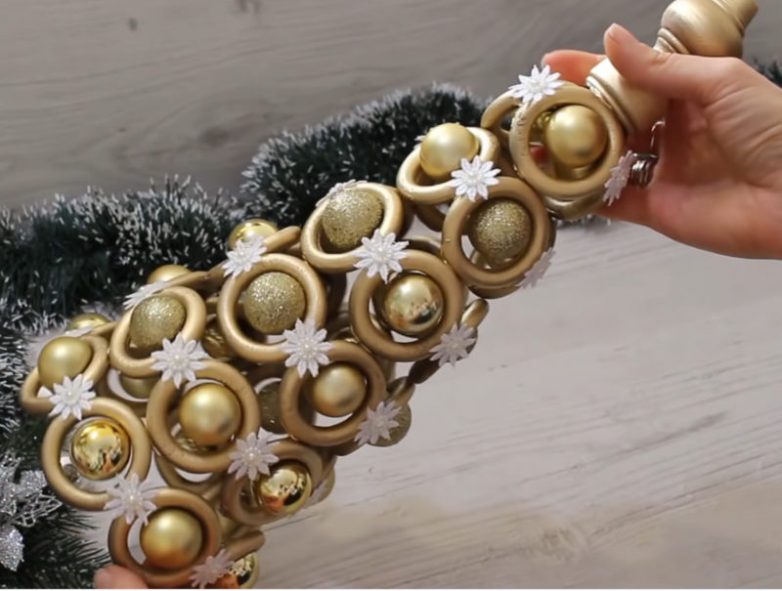 Для декора используйте небольшие белые цветы или снежинки, а также маленькие новогодние шарики, диаметр которых будет немного меньше диаметра колечек.