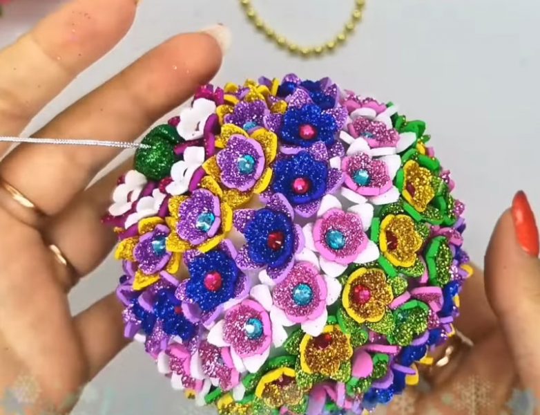 Поэтапный процесс оформления пенопластового шарика глиттерным фоамираном можно посмотреть на видео: