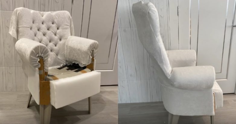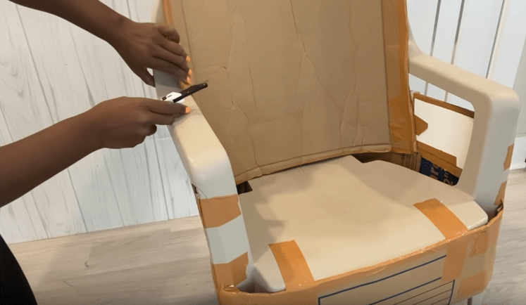 Теперь с помощью поролона «наращиваем» кресло во всех необходимых местах, попутно завершая форму. Например, делаем подлокотники более объемными, а сидение — более высоким. Поролон закрепляем при помощи клея и скотча. Затем перетягиваем все кресло тканью, фиксируя ее при помощи строительного степлера.
