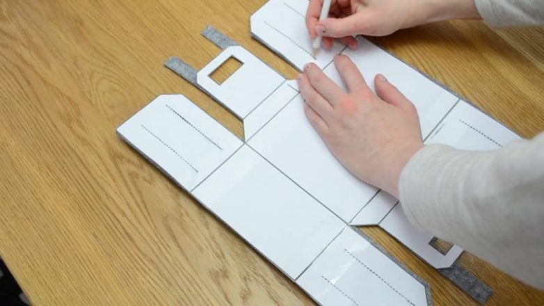 Приложить на фетр и вырезать, немного удлинняя ручки, как показано на фото ниже. Не забудьте прорезать отверстия так же, как и на шаблоне!