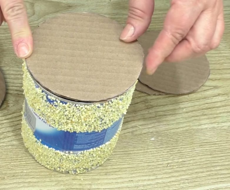 На одну сторону самого большого картонного круга приклейте два вырезанных круга меньшего диаметра, это позволит получить крышку, которая будет крепко закрывать банку.