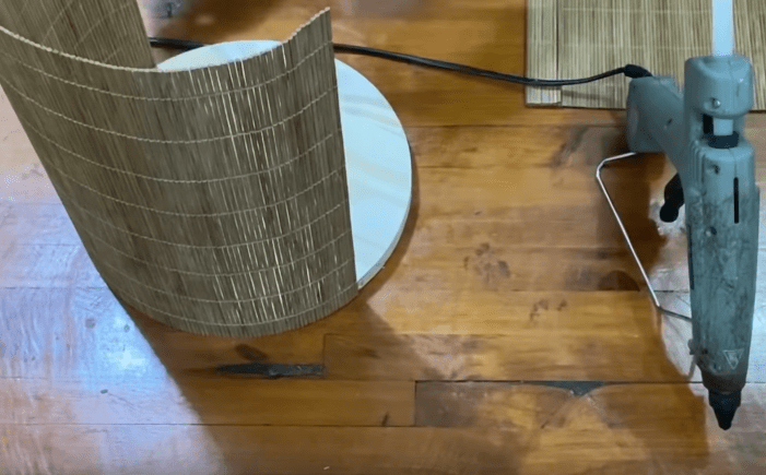 Определившись с дном, выбираем материал для стенок и начинаем их формировать. В нашем случае это циновка, но подойдет и другой материал, например, фальш-панель или даже плотный войлок. Отмеряем детали необходимого размера и вырезаем их. Затем выбранным материалом обклеиваем дно, формируя стенку будущей корзины.