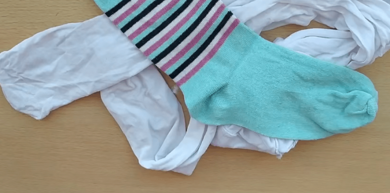 Для реализации идеи достаточно одного носка подходящей расцветки и половины чулка от колгот. Также понадобятся нитки и немного витой пряжи.