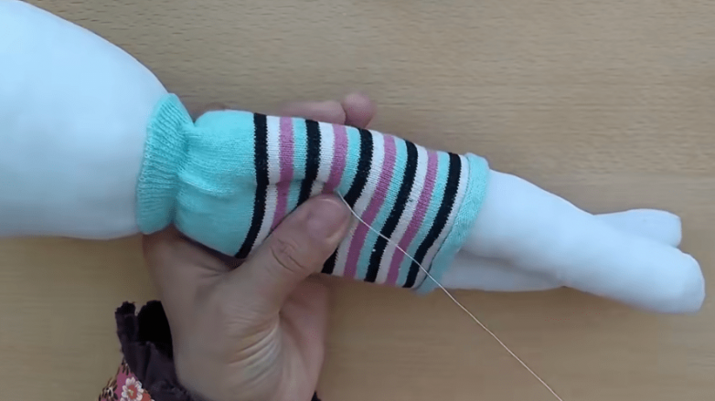 Из носка формируем красотке платье. Для этого достаточно обрезать ту часть, которая находится выше пятки и обработать линию разреза. Натягиваем носок на туловище так, чтобы резинка поднималась к шее и расправляем его. Затем формируем руки, насквозь прошивая крепкой нитью туловище так, чтобы стяжка выглядела аккуратно с обеих сторон.