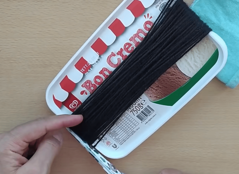 Определяем длину волос и делаем соответствующую намотку. Для этого можно использовать кусок картона, крышку от лотка или книгу нужного размера. После того как намотка готова, снимаем ее с основы. Делаем перемычку из ниток с одной стороны, а с другой разрезаем.