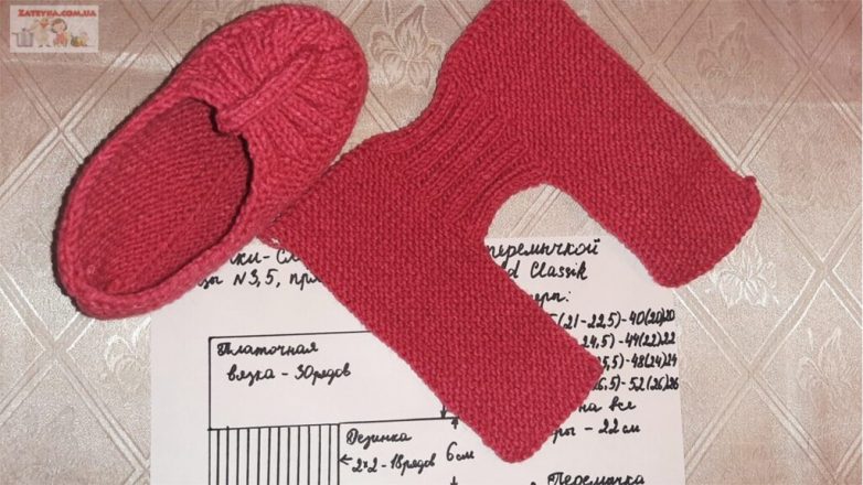 Описание работы. Я буду вязать на самый маленький размер 34-35, вязание и количество петель для всех остальных размеров указаны на схеме и в моем видео-уроке. На спицы №3,5 набираем 40 петель и вяжем платочной вязкой – в лицевых и изнаночных рядах все петли лицевые – 30 рядов. В 31 ряду закрываем первые 20 петель остальные петли до конца 31 ряда довязываем лицевыми петлями. Оставшиеся 20 петель (верх тапочка) вяжем резинкой 2 на 2 18 рядов (6 см).