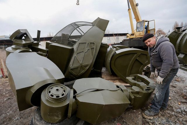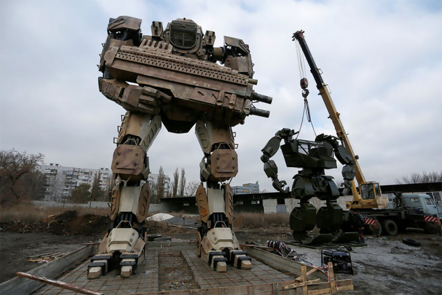 Этих роботов-трансформеров высотой 13 и 6 метров, которых можно увидеть возле автомастерской в Донецке, построили из металлических отходов, включая автомобильные детали. Они весят около 4 и 2 тонн соответственно.
