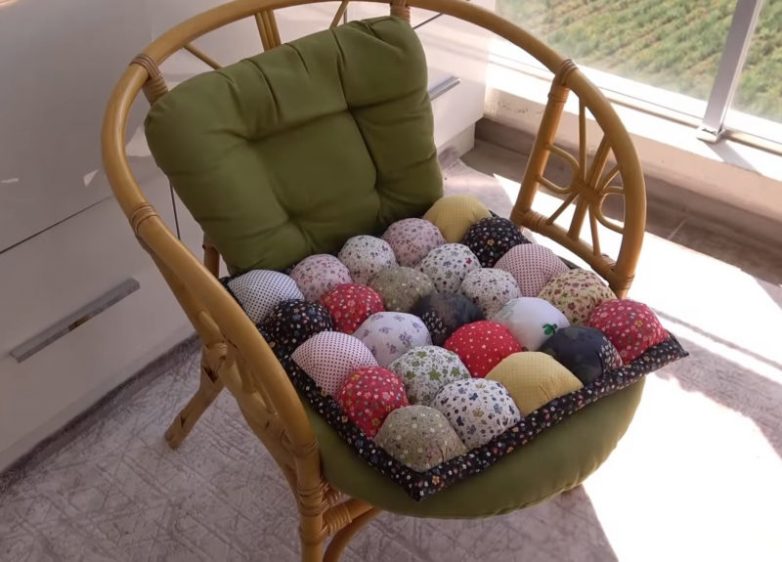 Остатки ткани и лоскуты — настоящий клад для креативных рукодельниц. Из ненужных на первый взгляд вещей можно сделать чудесные элементы декора. Так, остатки тканей можно превратить в яркую и удобную сидушку для кресла.