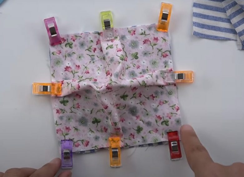 Сложите вместе один маленький квадрат и один большой и скрепите их зажимами таким образом, чтобы сторона заготовки была равна 11 см. Для этого на лоскуте большего размера сформируйте складки посередине.