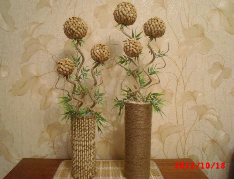 Топиарий. Для начала нужна определиться с основой под горшок для мини-дерева. Затем в емкость можно залить гипс или монтажную пену, при этом нужно, чтобы ствол мини-дерева крепко держался. На поверхность горшка выкладывают декоративные элементы. После этого определяются с материалом для основы верхушки мини-дерева на которую будут клеить природный материал. Основа должна быть круглой. После чего на выбранную основу приклеивают косточки абрикоса. По желанию можно окрасить все в белый цвет.