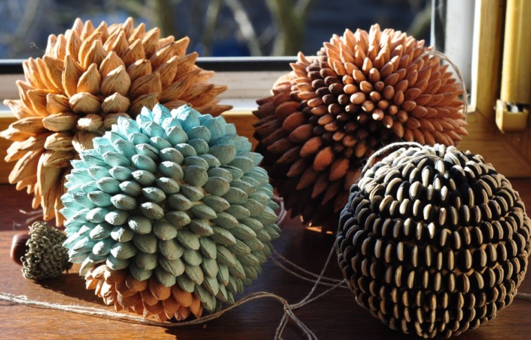 Употребляя фрукты наверняка многие не задумываются, что из того что от них остается можно сделать красивые украшения для дома или детскую игрушку, поделку, используются косточки персиков или абрикосов. В такие украшения можно добавить тыквенные семечки.