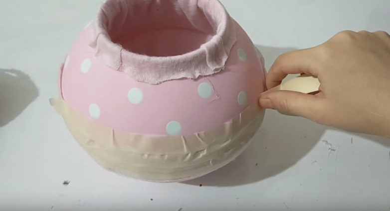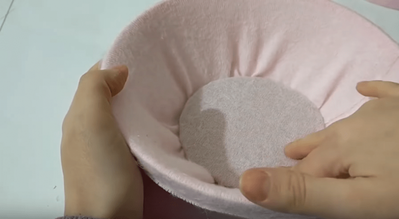 Далее обтягиваем обе миски тканью с внутренней стороны. Ткань фиксируем при помощи горячего клея. Для миски, у которой осталось дно, вырезаем из картона кружок по размеру дна, его также обтягиваем тканью, а затем вклеиваем в центр, чтобы замаскировать места склейки.
