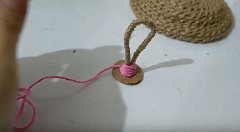 Для удобства сделаем для крышки ручку. Сформировать ее можно из проволоки, например, в форме петли. Получившуюся заготовку из проволоки обвязываем джутовой нитью. Затем вырезаем маленький кружок из картона, приклеиваем к нему ручку из проволоки и также оплетаем их джутовой нитью.